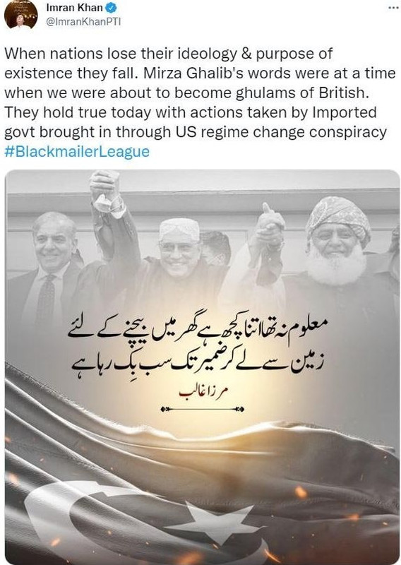Imran Khan used the hashtag of Black Mailer League with the picture and said that when nations forget their ideals and goals of survival, they become victims of degradation, Mirza Ghalib said this at that time. When we were enslaved by the British, these words of his are being proved by the actions of the government imported from the American conspiracy.